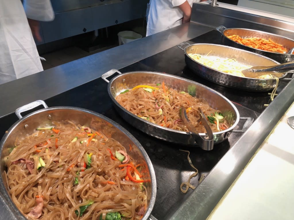 佐世保港を出港したこの日の夜は『フォーマル』のドレスコードが指定されていました。寄港地から戻ってからのフォーマルナイトって結構慌ただしいんですよねー。私たちはフォーマルに着替える前にラフな服装でブッフェで食事をとることにしました。