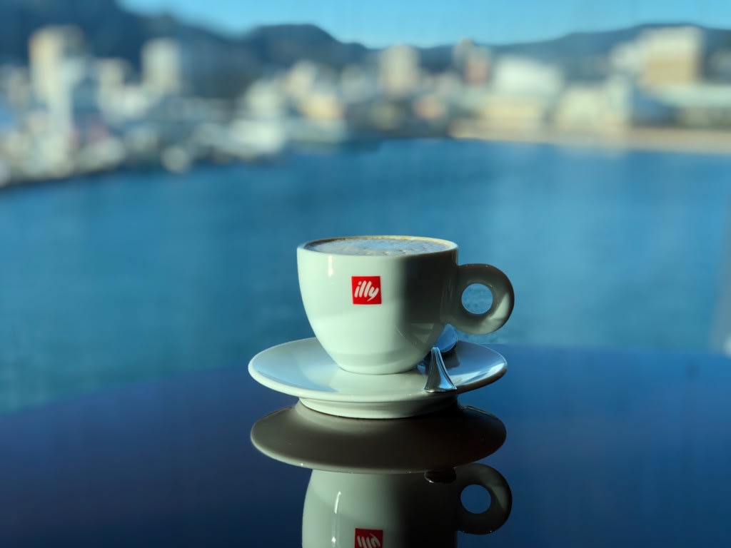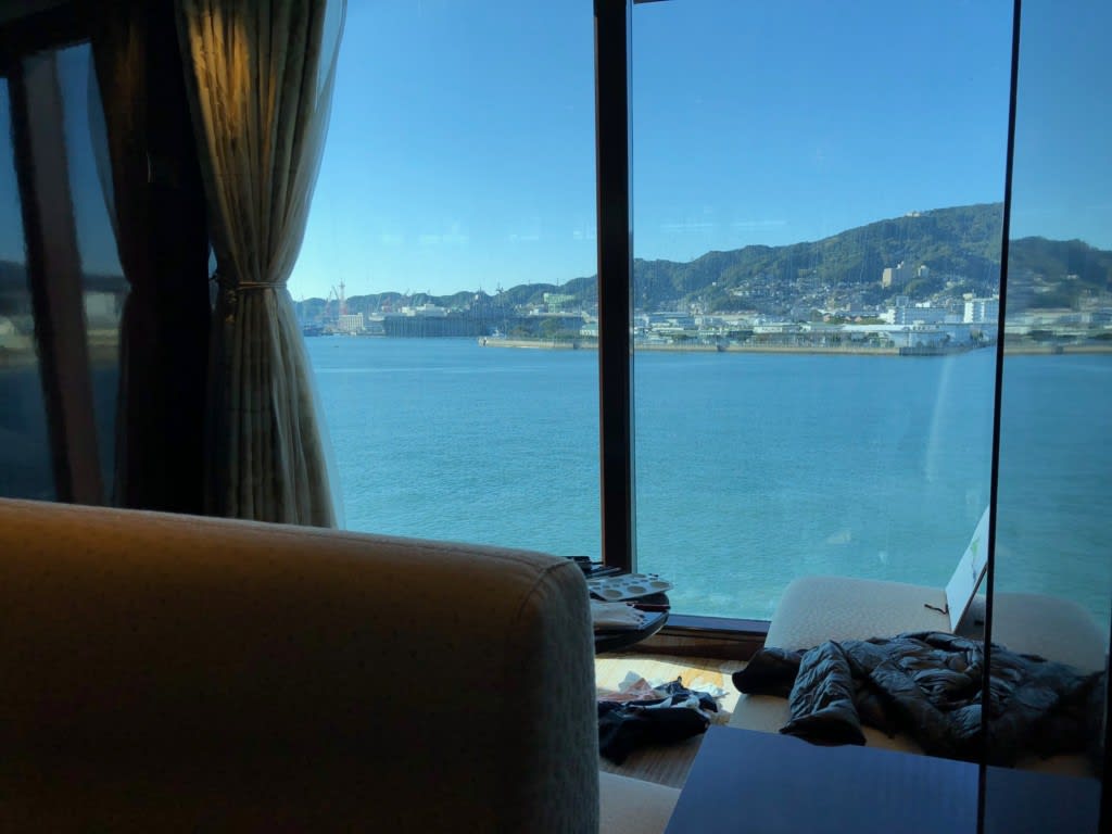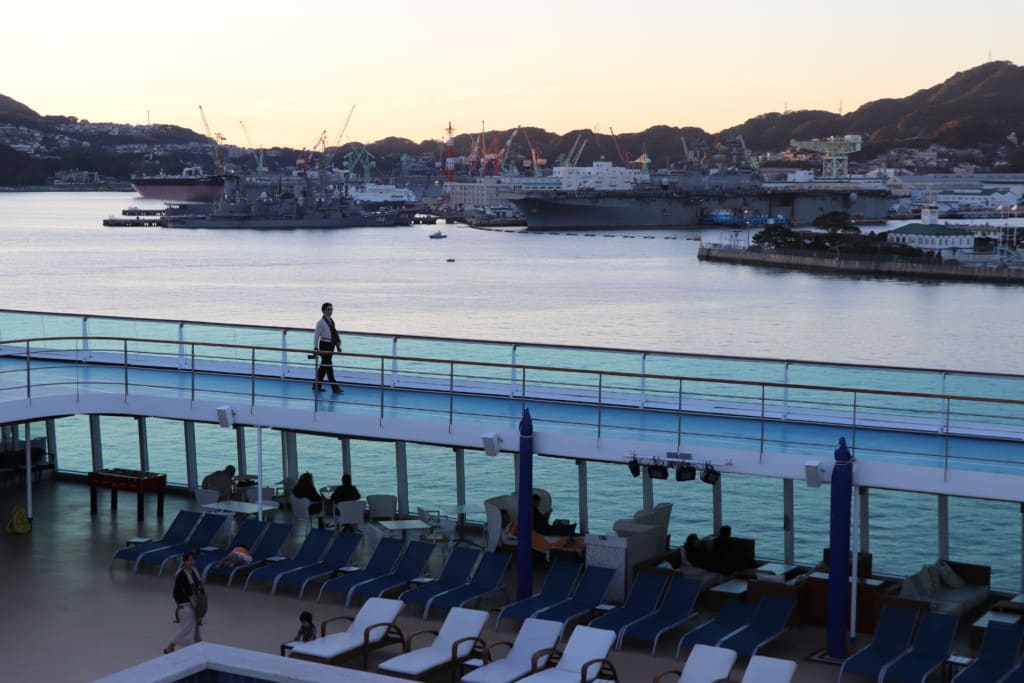 私たちもカクテルを何杯か飲み、ダラーっとして佐世保港を眺めていました。締めにカフェラテ。オールインクルーシブドリンクパッケージなので飲み放題です。