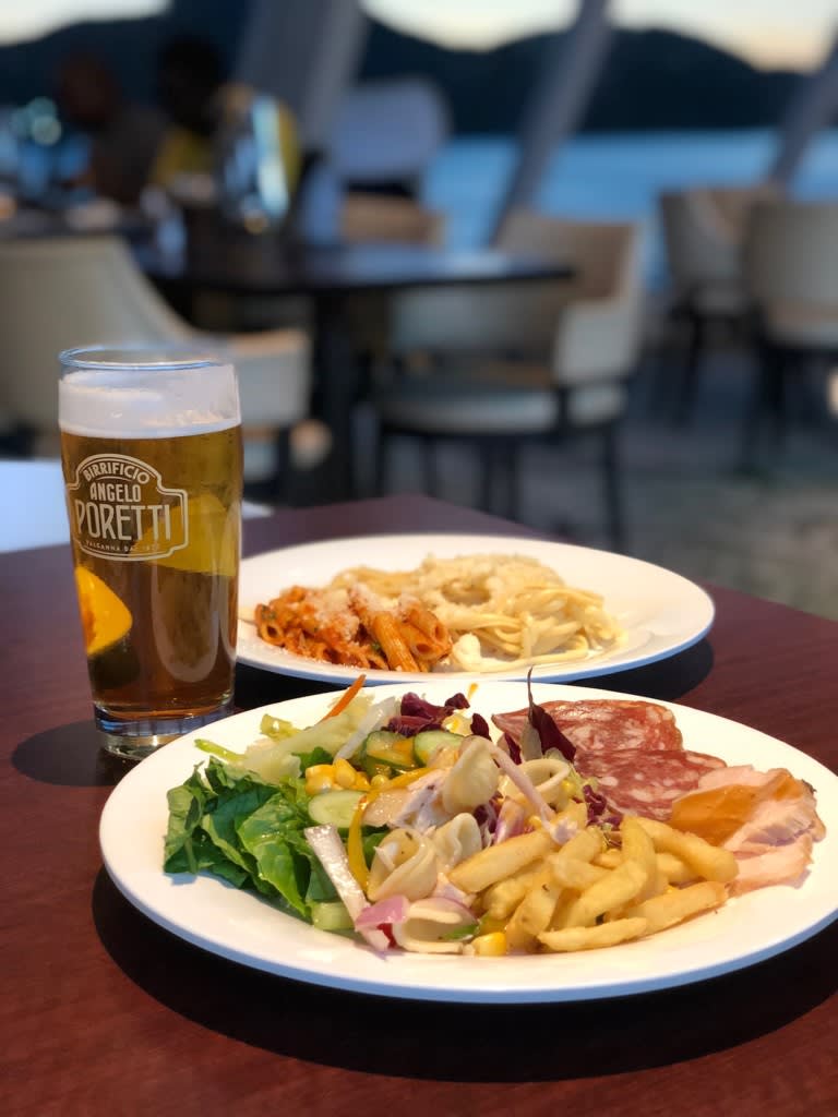 まだ陽が落ちない前にジャルディーノに入ったので船尾の窓から美しい夕焼けを堪能。夕方の早い時間にビールと好きなものを食べてのらりくらりするのが最高の贅沢です。船旅やめられません(笑)。