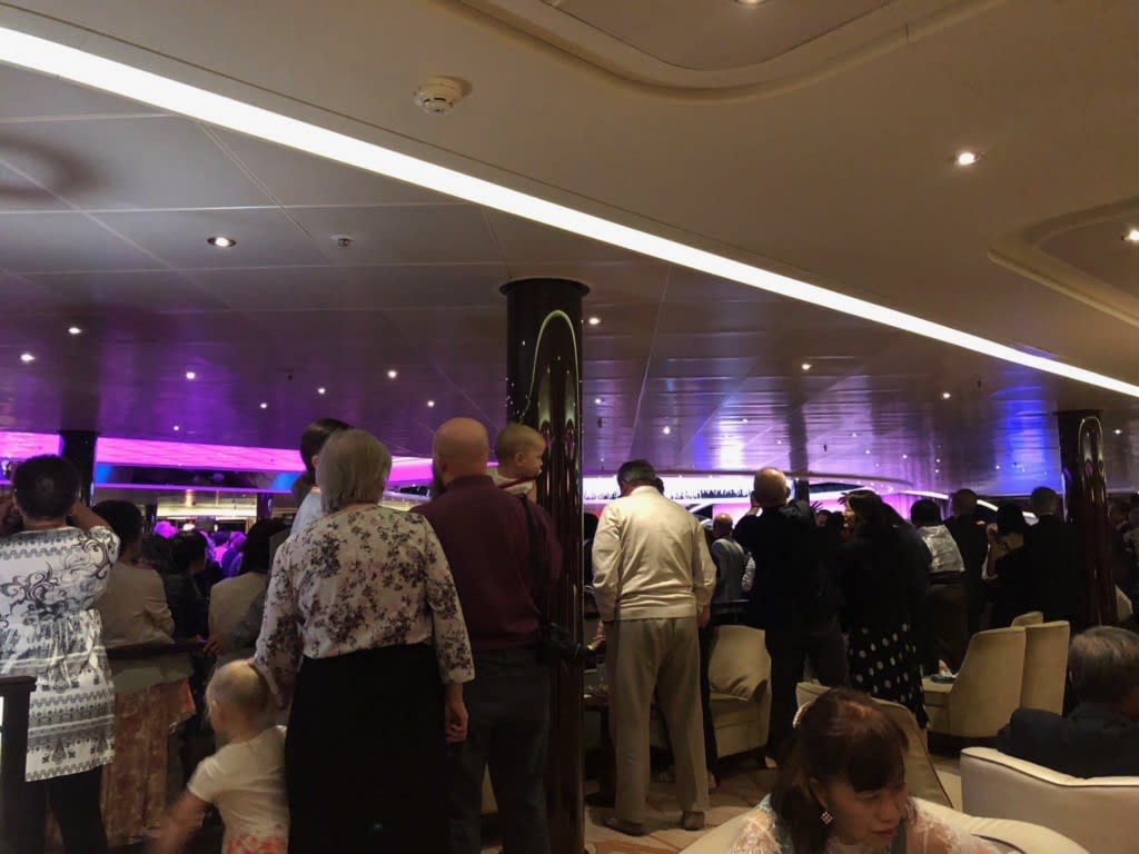 人が多過ぎてクルーが捌き切れない感があり、シャンパンやソフトドリンクも中々回って来ず、そしてオフィサーの紹介から始まるパーティーもどんどん遅れていきました。お隣に座っていた欧米人のご夫妻は「待ってられない」と言った表情で始まる前に離席されていました。