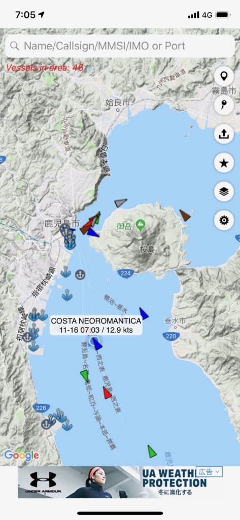 水先案内人(Pilot)も乗船し、徐々に鹿児島港へと向かっています。