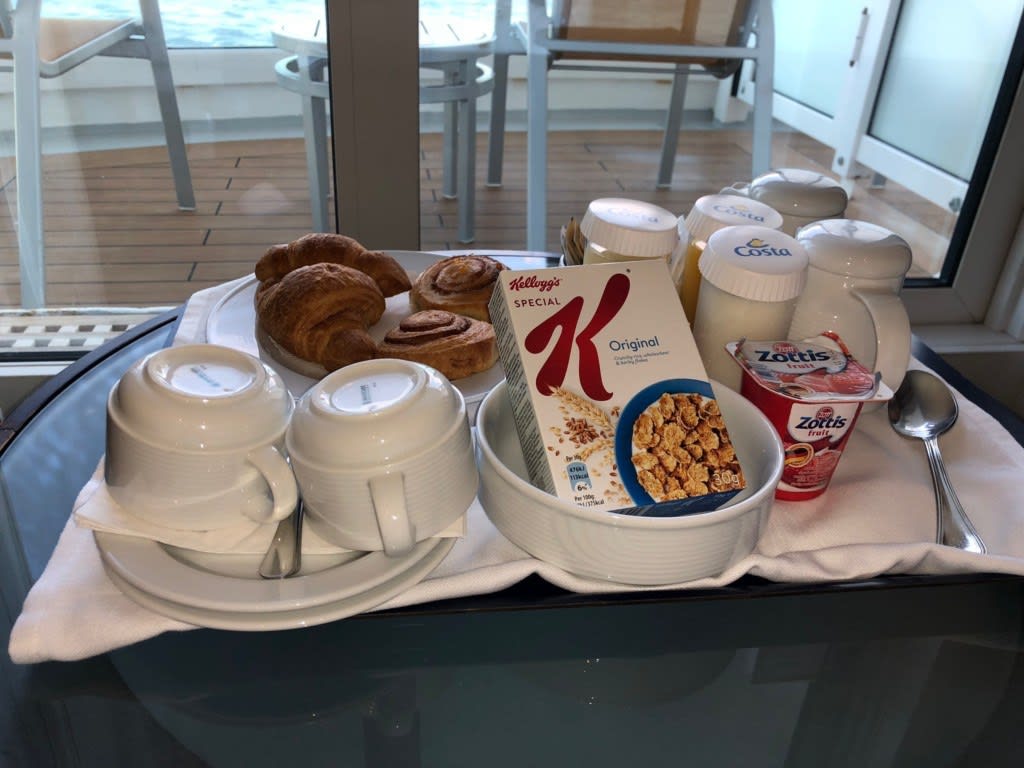 6日目の朝食はこのクルーズでもはや3度目の『モーニングサービス』。前夜までに手配していたので起きたらすぐに食べることができました。鹿児島港では8時入港、最終乗船は15:30となっていてあまり時間がありません。下船のOKが出たらすぐに出発したいので朝食は簡単に。
