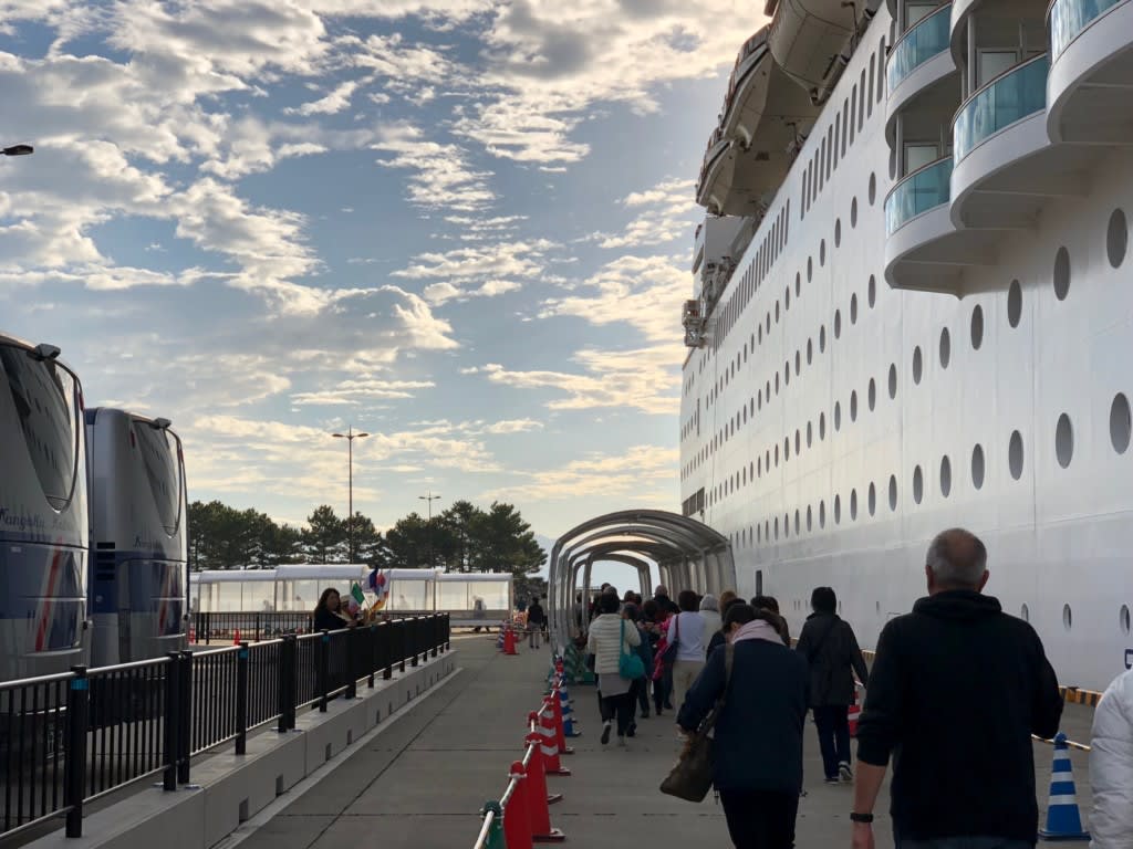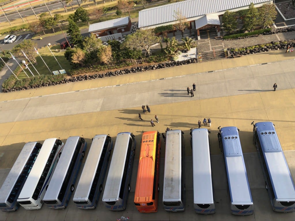 エクスカーション用のバスが既にスタンバイしています!↑この写真には写っていませんがクルーズターミナル横にはタクシーもスタンバイ済みでした。