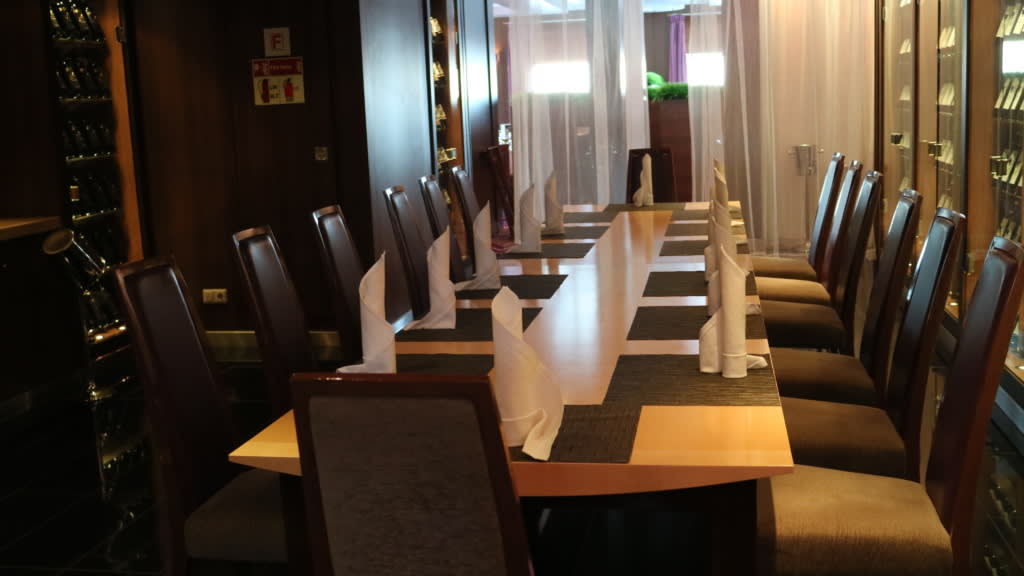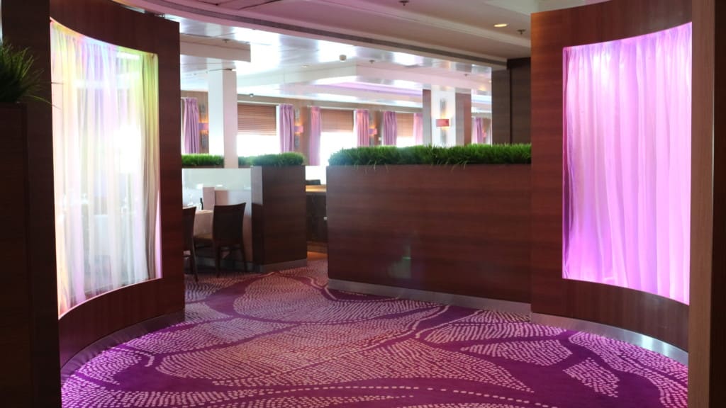 ブッフェレストランの爽やかさとは一転、ダイニングレストラン ウォーターフロントレストランの雰囲気はピンク、紫のグラデーション、仕切りに使われておるシフォンのカーテンがゆらゆらするムーディーな空間です。見学時はカーテン全開でしたが夜は素敵な雰囲気になるのではないでしょうか。