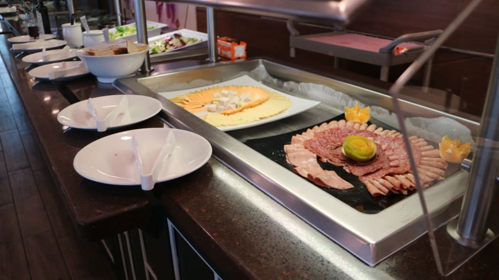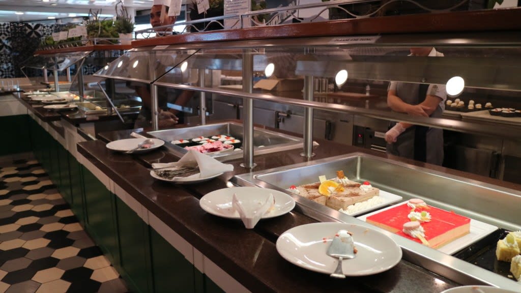 デッキ12後方部分は全てブッフェレストランになっていて、お料理のカウンターは中央部分を取り囲んでいて結構な種類がありました。スィーツカウンターも充実です。
