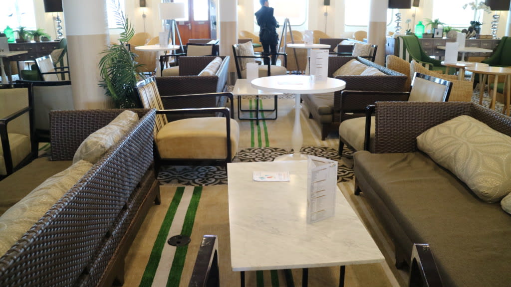 いろんなタイプのソファが置いてあり開放感がある明るいラウンジで下。