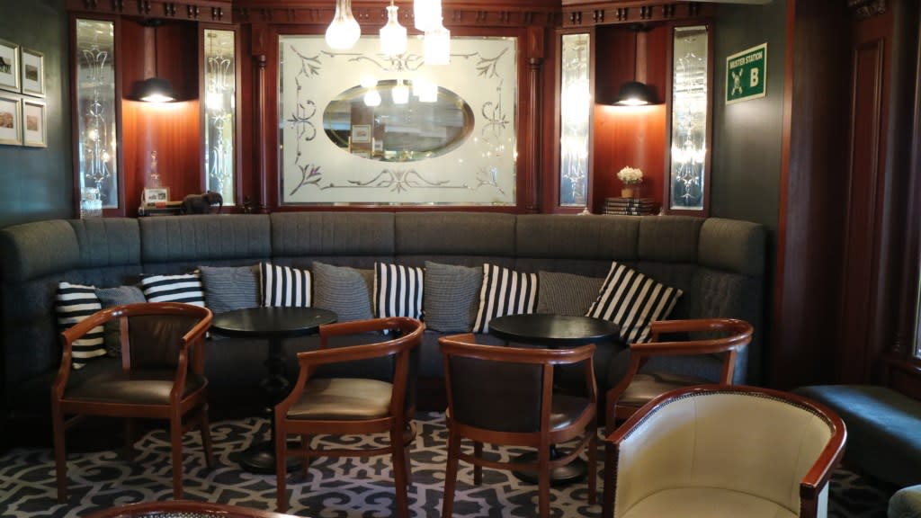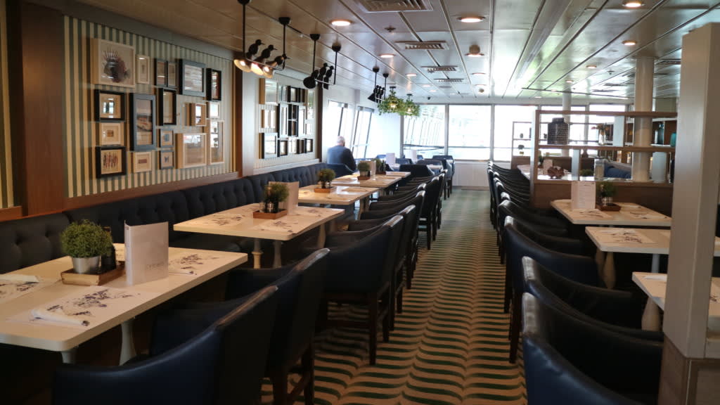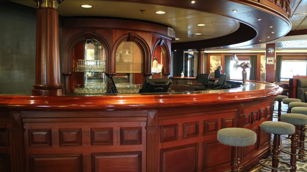 重厚な木のカウンター、ダークな色合いのファブリックが落ち着きのあるイギリスのパブが船上で楽しめるのはイギリスの船会社ならでは。