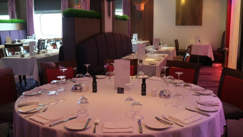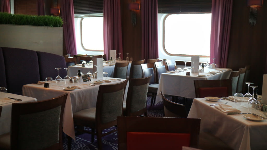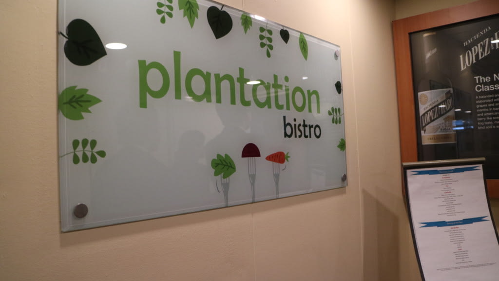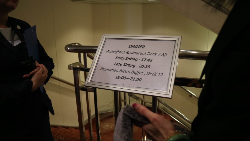 メインダイニングはデッキ7にあり、2シーティング制になっていました。ブッフェレストランのプランテーションビストロの案内も出ていますが、「ブッフェの開いている時間が短い」と思いました。