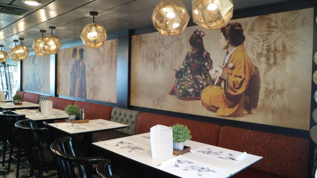 デッキ12、ブッフェレストランの並びあるおそらくカバーチャージが必要となるレストランの壁画にご注目!着物を着た女子の絵が描かれていたので「日本料理?」と思いきや…