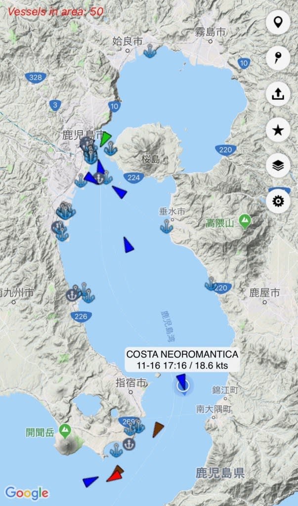 17時過ぎには指宿あたりを通過、鹿児島湾を出ました。