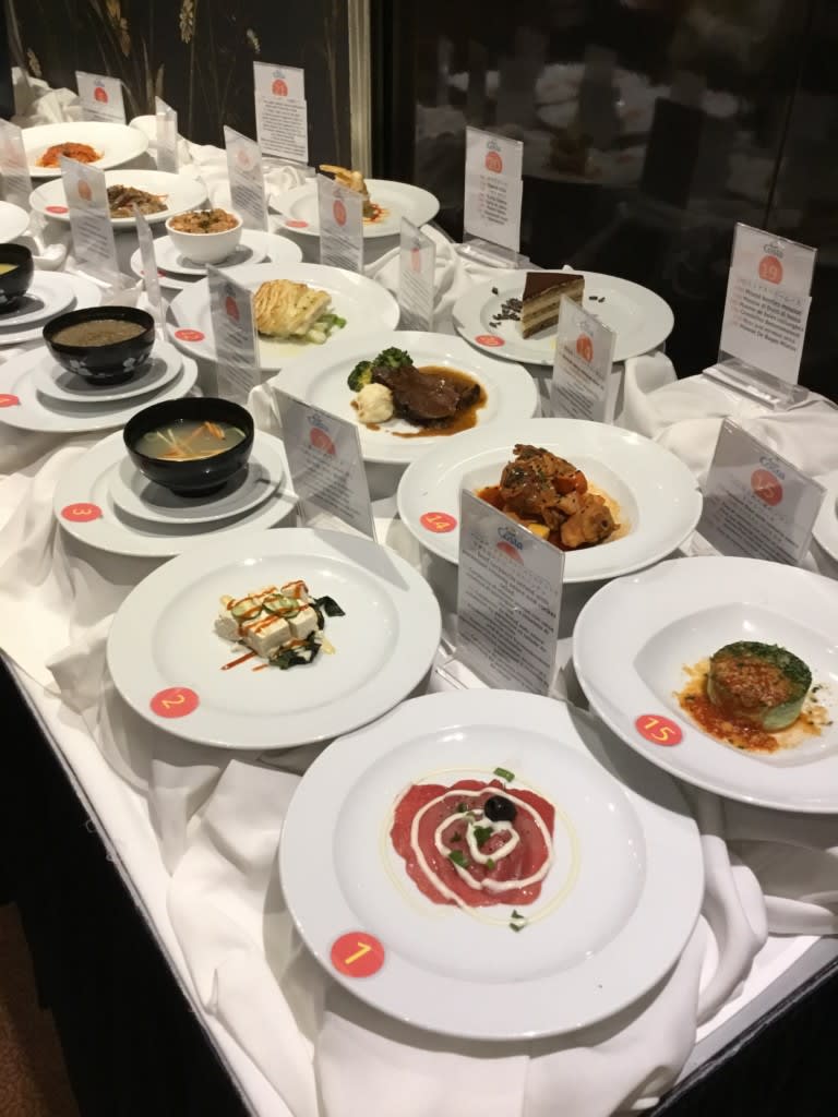 相変わらず人気の高いメインダイニングはこの夜のサンプルが出ると人が集まって混乱に!実際の本物のお料理がディスプレイされているのでブッフェと比較しやすいので助かります。
