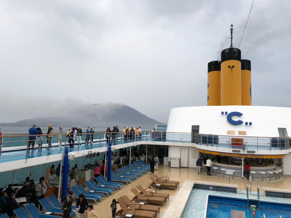 コスタネオロマンチカは定刻通りに鹿児島港を離れ、このあと東京・晴海埠頭へ向かう予定となっていました。鹿児島港を離れても雄大な景色を見せてくれる「桜島」。デッキでは乗船客でいっぱいでした。