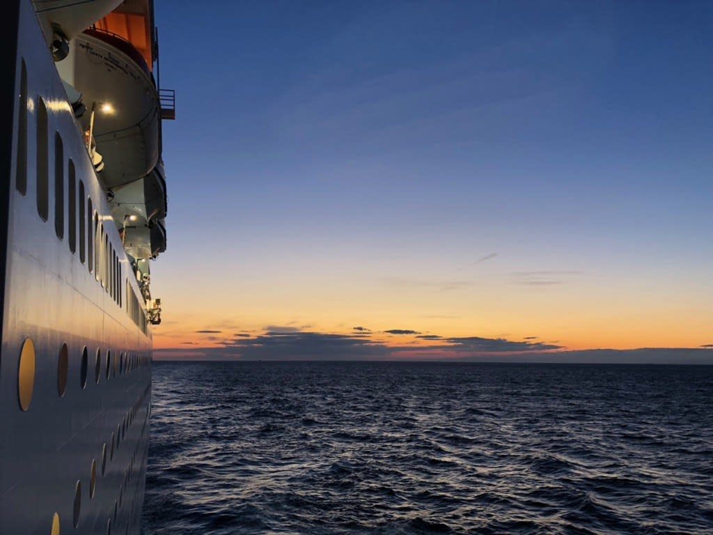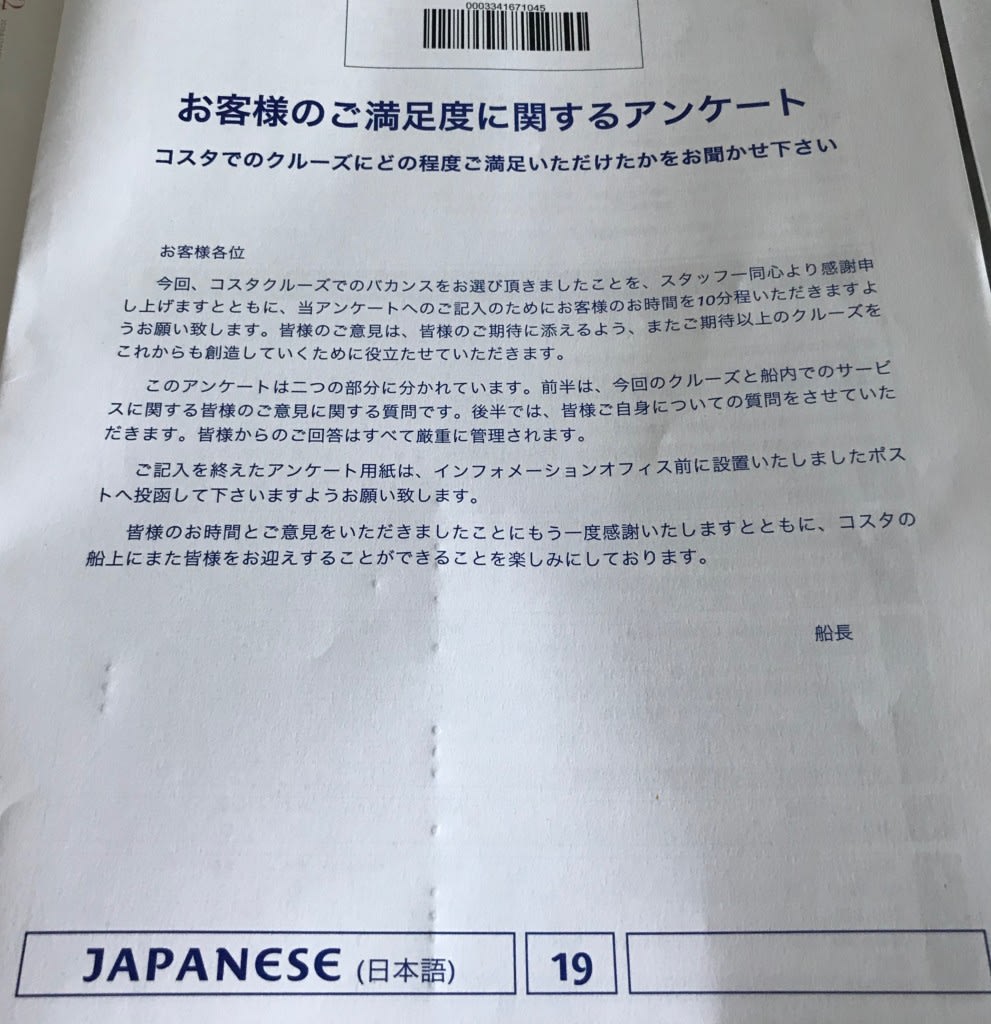 下船説明会でのアンケート記入の方法を思い出しじっくりアンケートを記入しました。4ページほどありました。日が暮れたらまた食事。ラストディナーです。