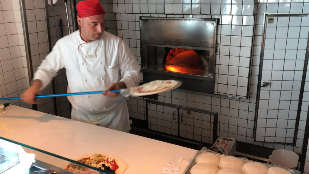 混んでいればなかなかピザもテーブルには運ばれてこないのでピザを作っているところを撮影しに行ったのですが、ちょうど作っているピザがオーダーしたものでした!