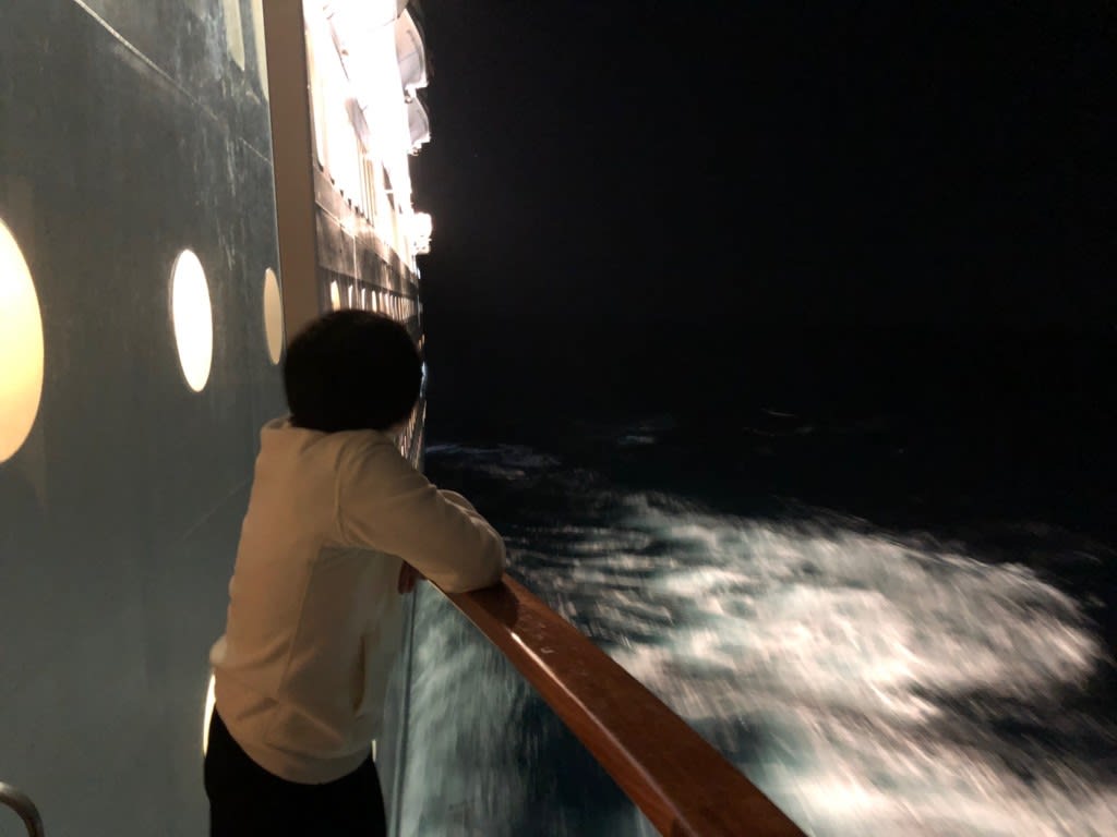 クルーズ最後の夜はバルコニーで波しぶきを眺める…。(渋)隣室からは賑やかな笑い声が聞こえてきました。