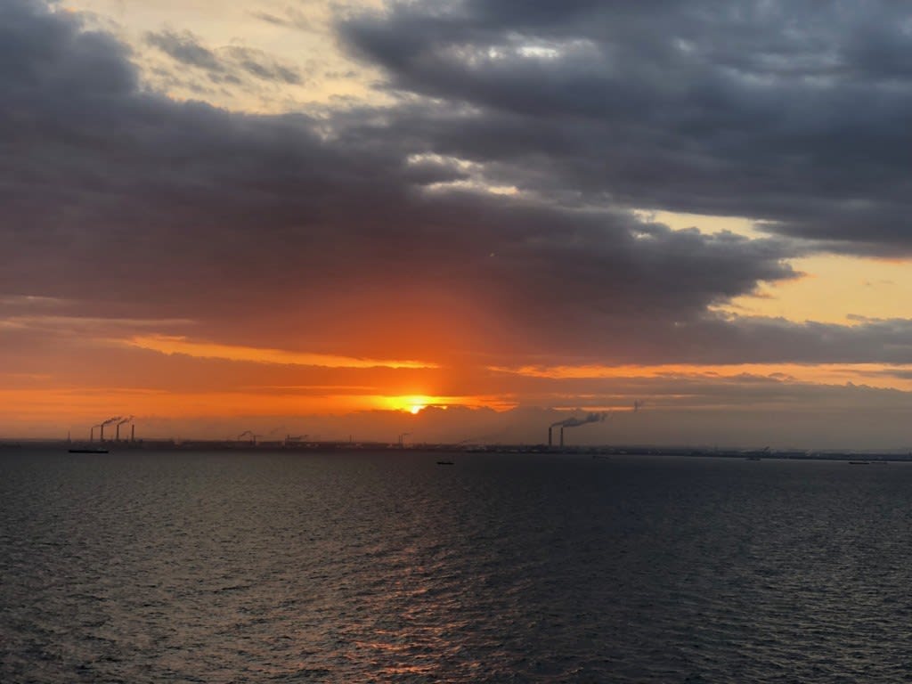 夕焼け感たっぷりの日の出の様子。6時30分前後デッキに人が集まりだしました。上着がないと寒いくらいに秋が深まりました。