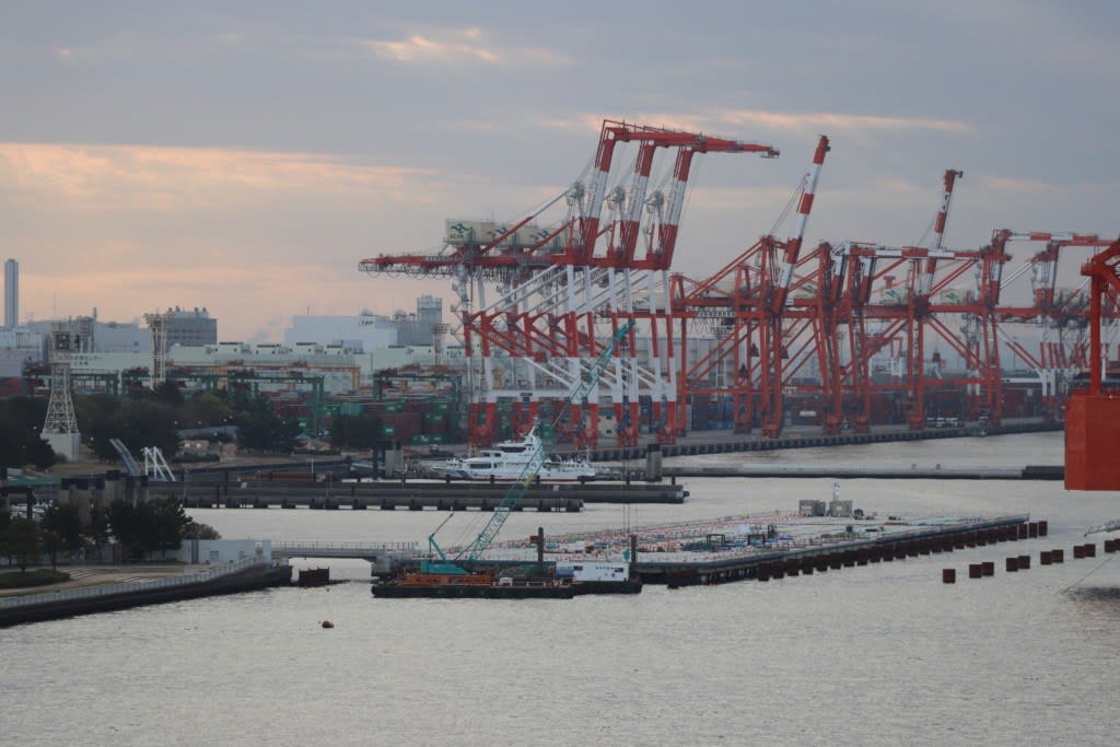 入港予定は8時。6時30分頃には既に東京湾の中に入っていて「下船も早まるのかな?」と思いましたが、船内新聞には『晴海港での下船許可が下りるまで最短45分ほどかかります』という記載があり、実際には7時頃には着岸していたと思います。