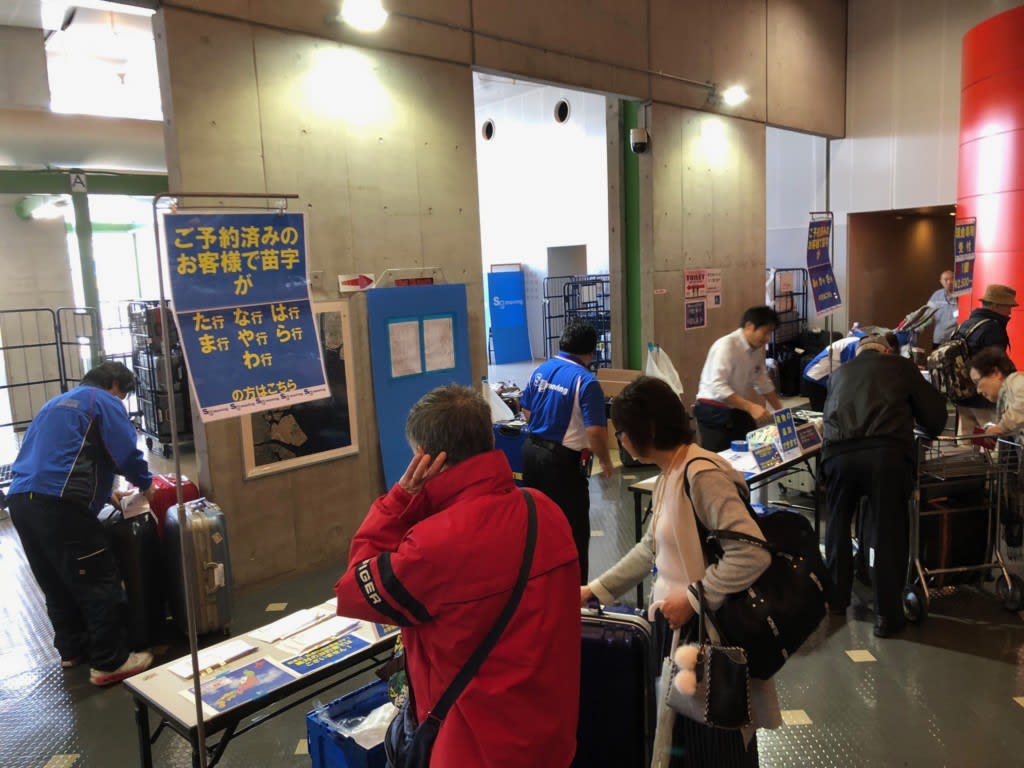 晴海で乗船した際、チェックインした場所にスーツケースがタグ色別に置いてありました。すぐにピックアップできました。この流れは物凄くスムーズでストレスなし、感動です。