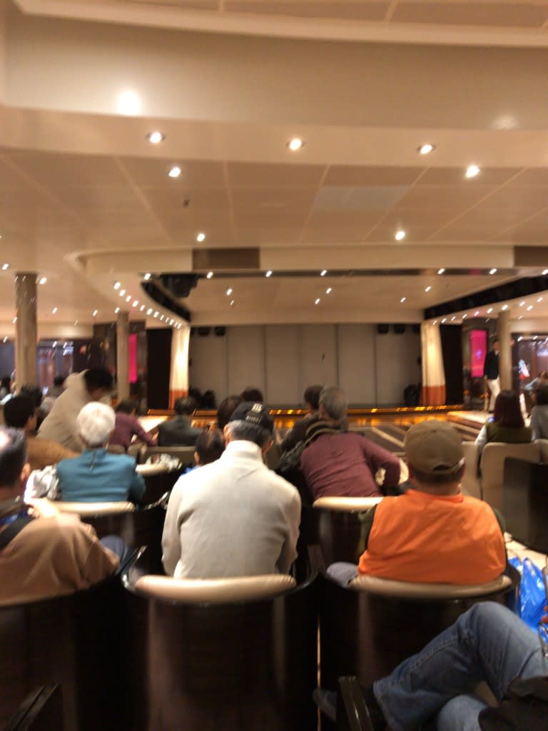 前夜に配られたスーツケースにつけたバゲージタグ(荷物タグ)の色別順に下船が始まります。色別に船内の集合場所に集まり下船の合図を待ちます。他の船も同様の流れだったので「ちょっと時間がかかるかな」と思いましたが、着席してすぐに下船合図があったので結果すぐに下船ができました。