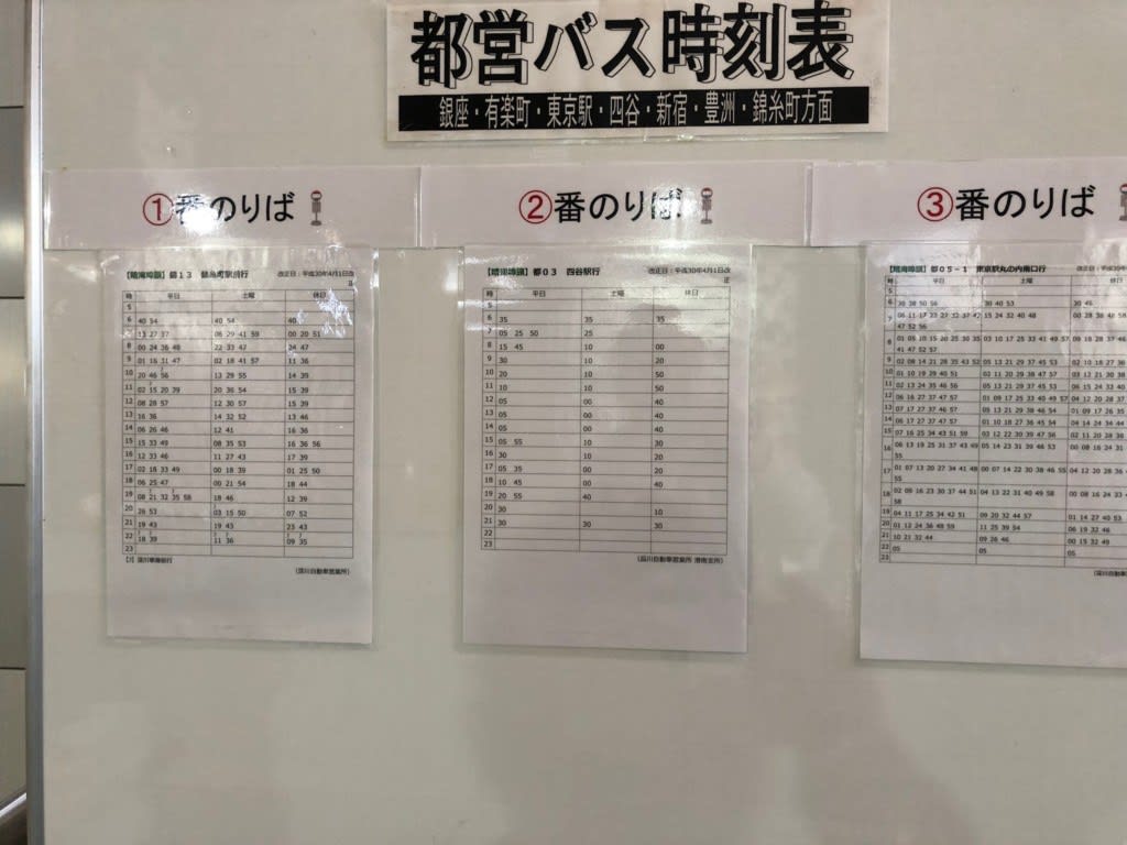 銀座・有楽町・東京駅・四谷・新宿・豊洲・錦糸町各方面に行くとバスの時刻表も張り出してあります。