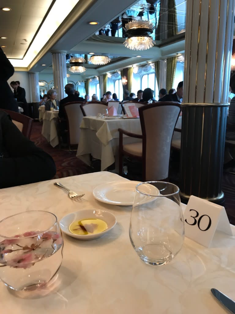 個人的には初日のディナーで使用されていた飛鳥のマークがボコになっている白い小皿(↑テーブル中央、オリーブオイルとバルサミコ酢が入っているお皿)が欲しかったので船内ショップを探しましたが見当たらず残念でした。