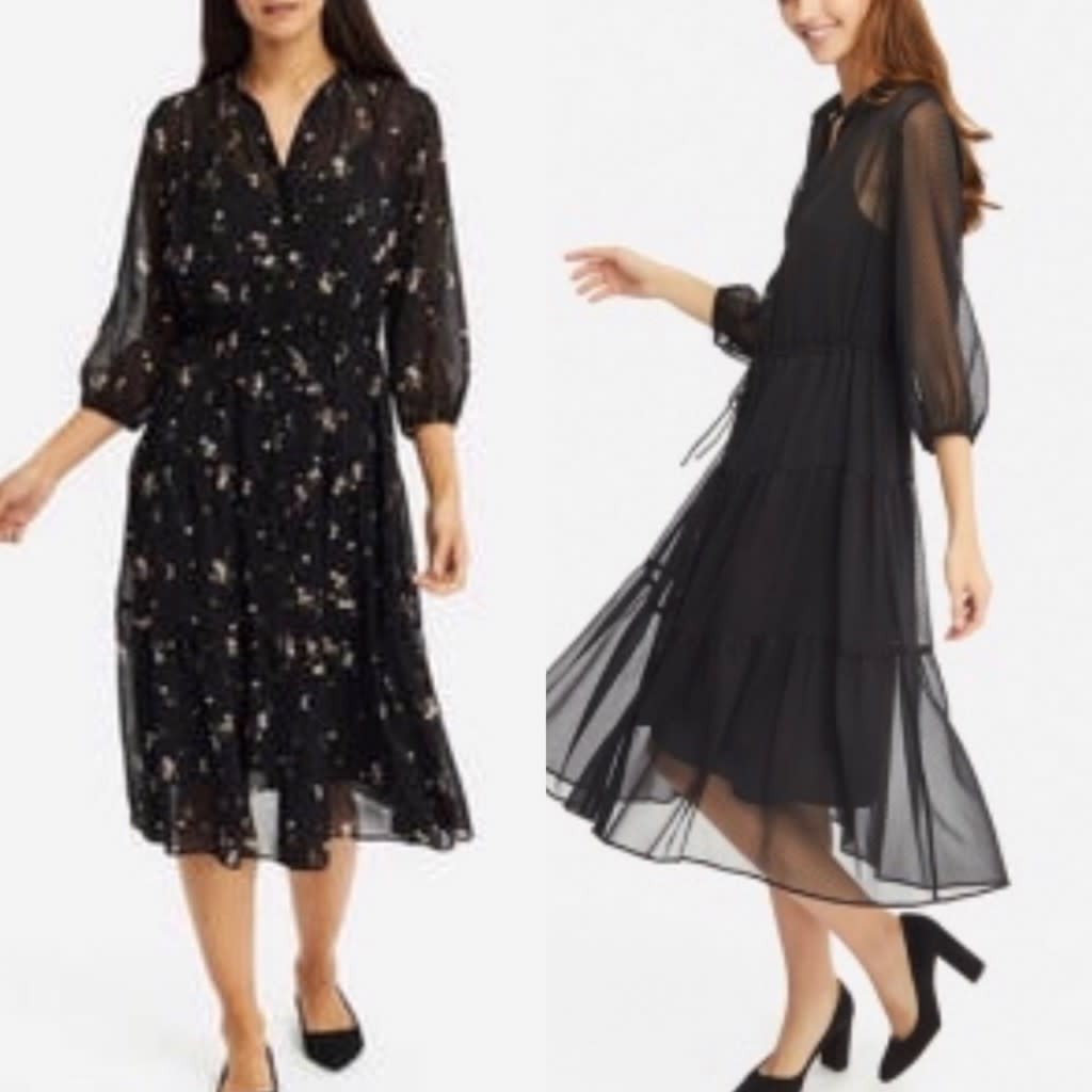 UNIQLOのシフォンワンピース(↑)は他にも無地の黒、ネイビーなどがありましたが今では黒しか店頭でも見かけません。