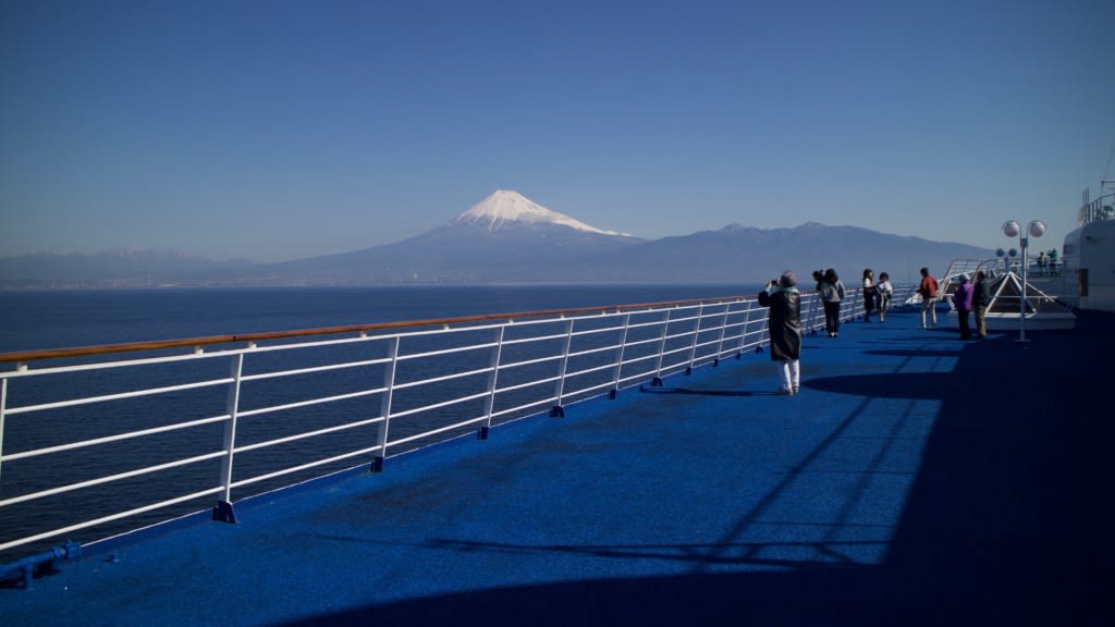 最初は船首で見えていた富士山も飛鳥IIが駿河湾をぐるりを回ったおかげで、船内のあちこちで見ることができました。最後は船尾のデッキから。