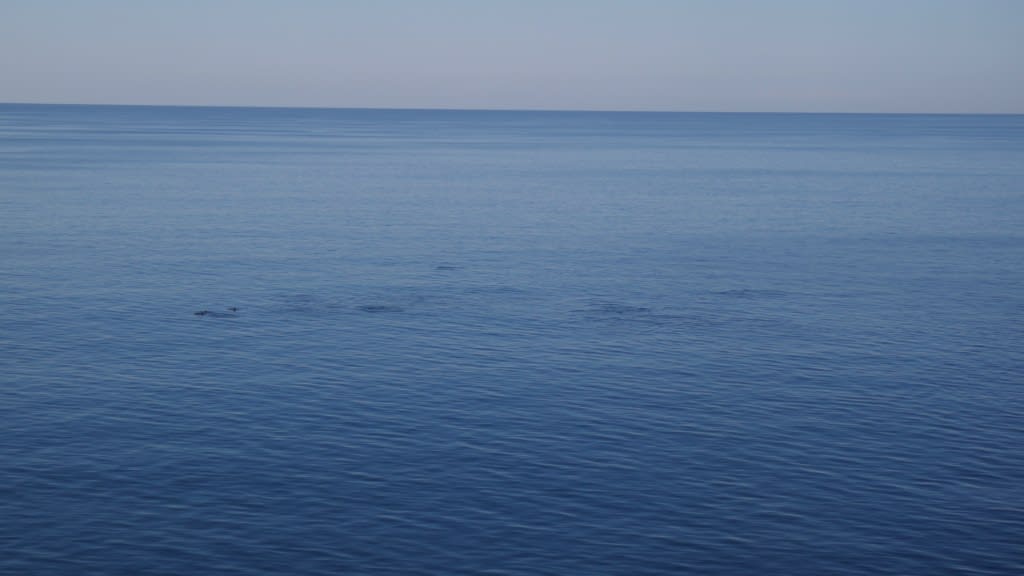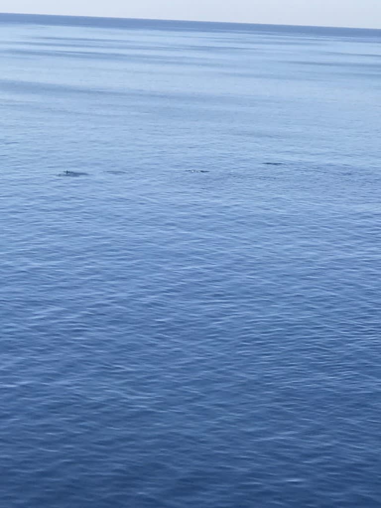 ラウンジに戻り再び寛いでいると、ブリッジから船内放送があり、「イルカの群れが泳いでいます」とのこと。↑いくつか波立っているところにイルカが!