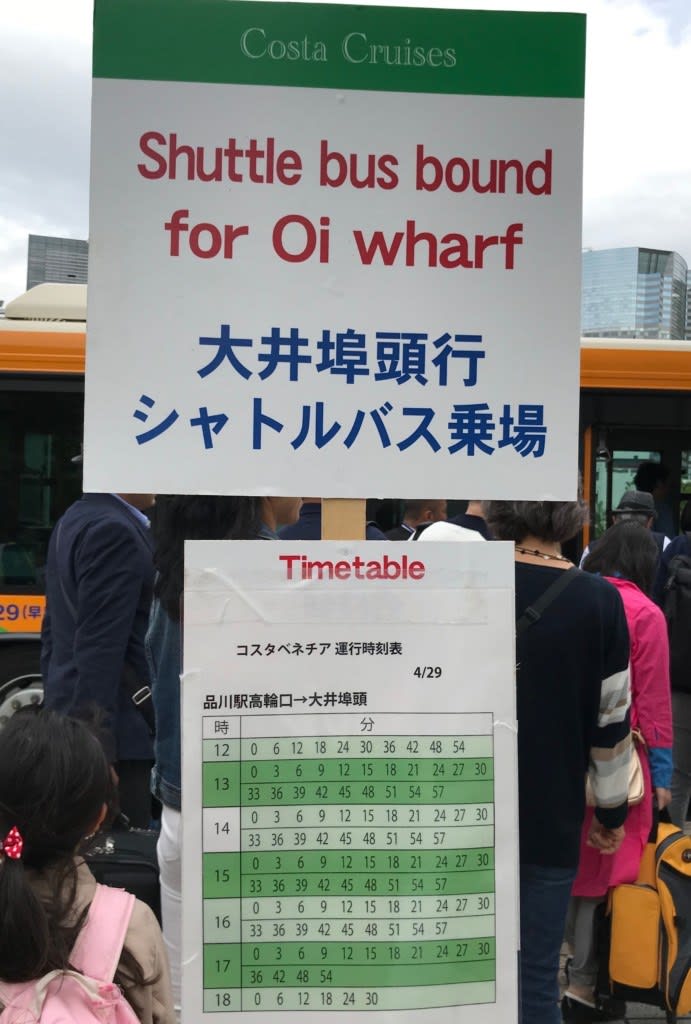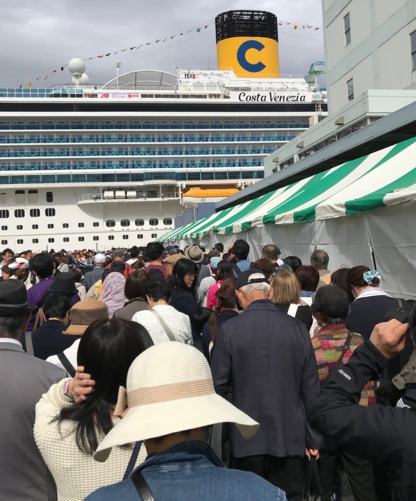 TKPガーデンシティからどんどんシャトルバスで乗船客が運ばれてくるのですが、コスタベネチアを前にして列は一向に先に進みませんでした。先に並ばれていた方に聞くと早くも「1時間以上待っている」ということでした。