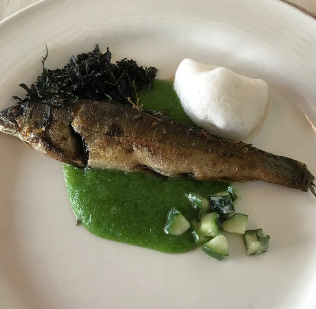 「鮎は頭から丸ごとどうぞ」との説明でしたので全ていただきました。内臓の苦い部分も全体のスパイスでした!緑のソースはキュウリで爽やかな味に。