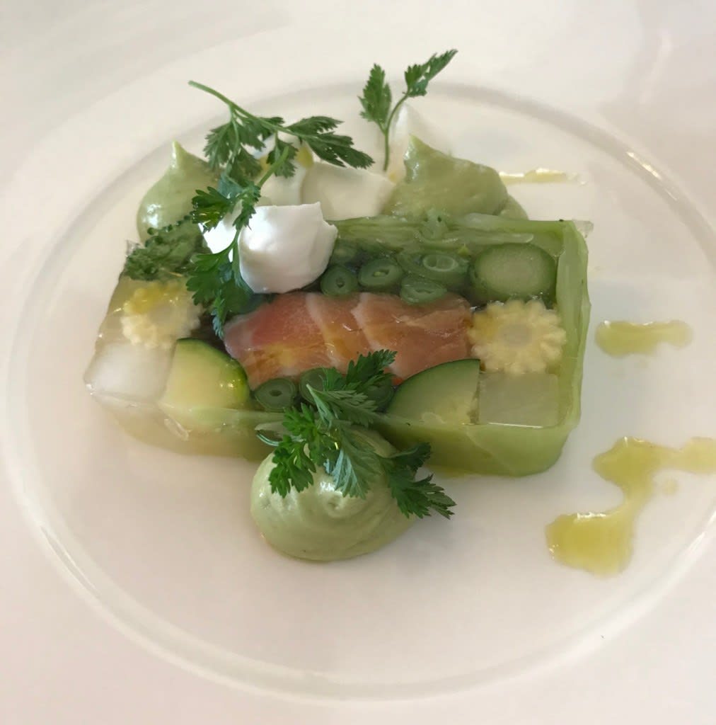 鮎のコンフィのきゅうりソースは意外な組み合わせで、下船後1ヶ月近く経ちましたが強烈な印象を未だに持っています。