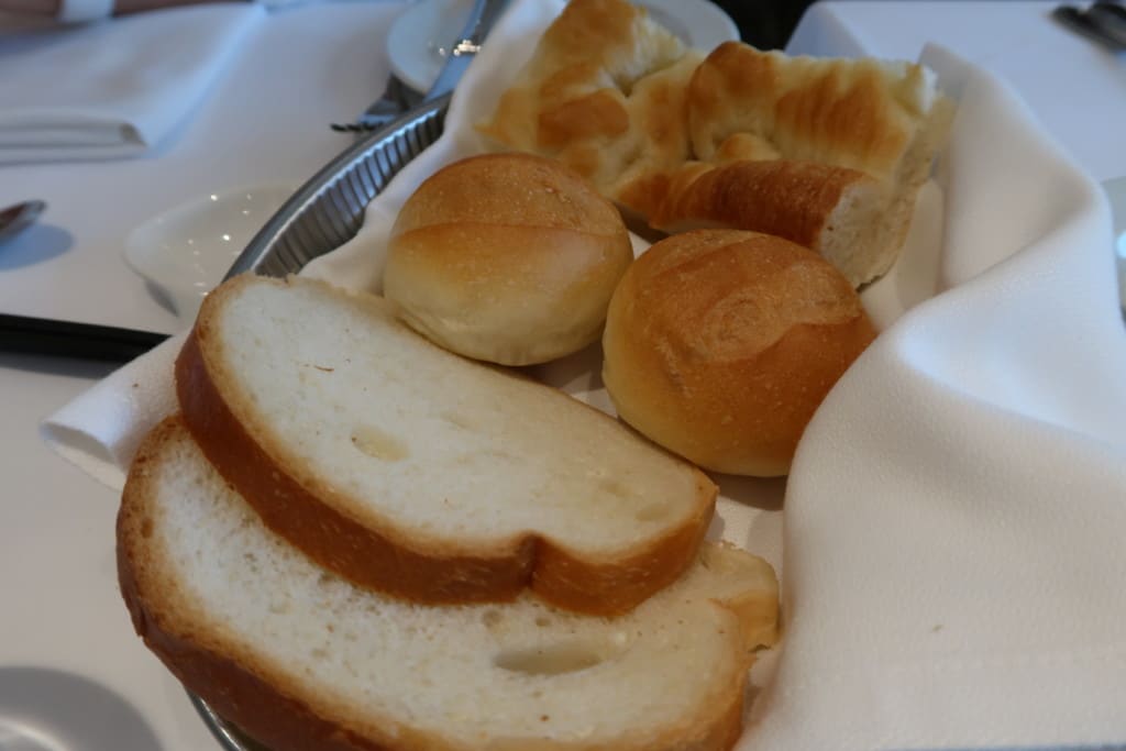 メニューも、オーダーも数少ないクルーを呼び止めることから始まり…オーダーが済んでも当然のことながら料理が運ばれてくるまでの時間はとても長く、テーブルパンとお水で間をつなぎます。
