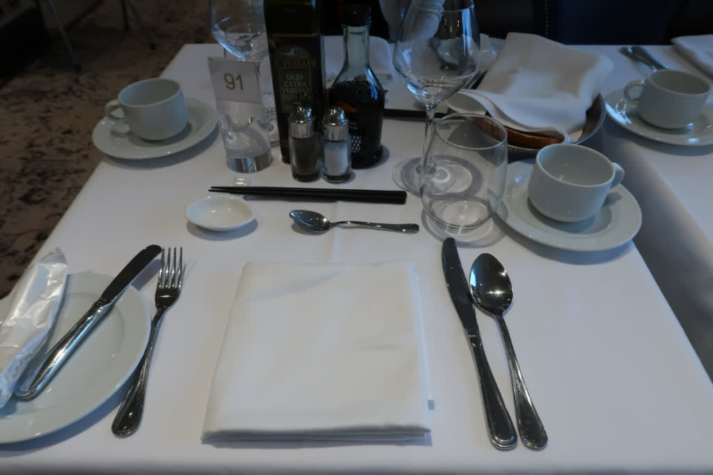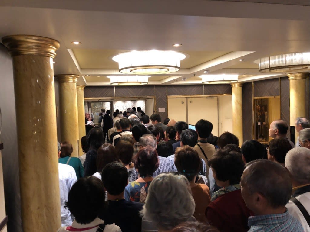 12:30からオープンでしたが、12:15頃に「イタリアンランチがまもなく開店」の船内アナウンスがあったせいか、レストラン会場に人が殺到!入り口に席を案内してくれるクルーがいるので列は進み待ちことなくテーブルには着けました、が…