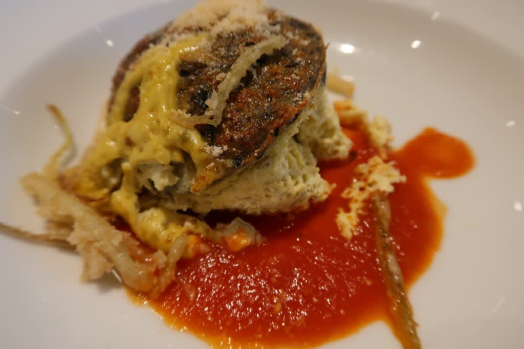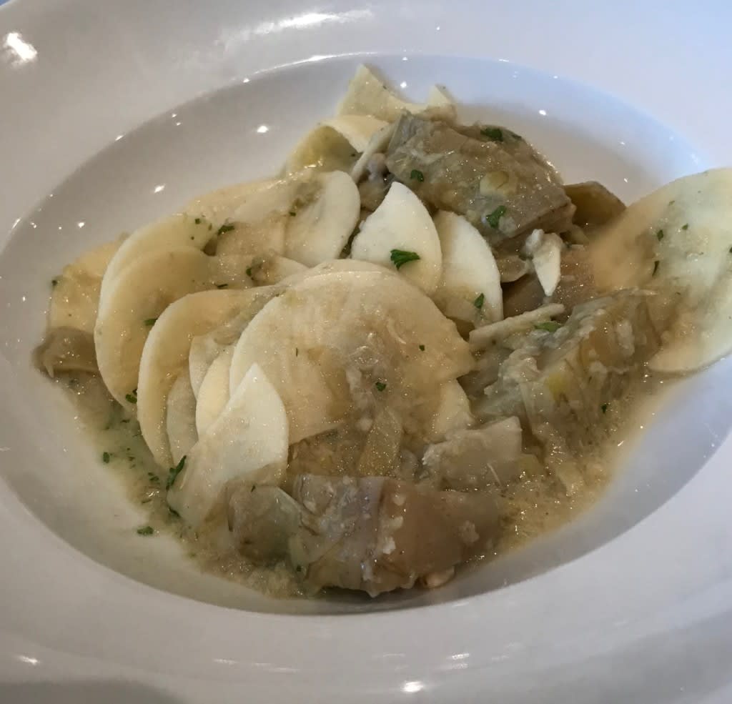 コルツェッティパスタとはジェノバ発祥の直径5〜7cmの平べったいパスタのことで初めて見ました!アーティチョークは大きめに入っていたでアーティチョーク好きには嬉しかったのですが、うっすら塩味がある程度で、どれだけ卓上塩をふりかけたかわかりませんでした!
