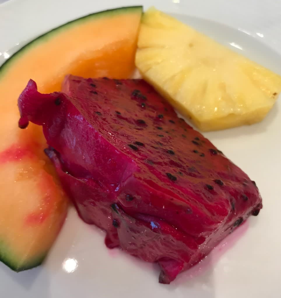 季節のフルーツ。ドラゴンフルーツはよく熟れて美味しかったです。メロンは完全に瓜…パイナップルの硬くて食べ応え(?)あり!
