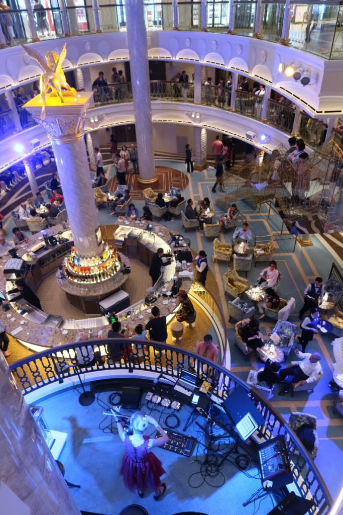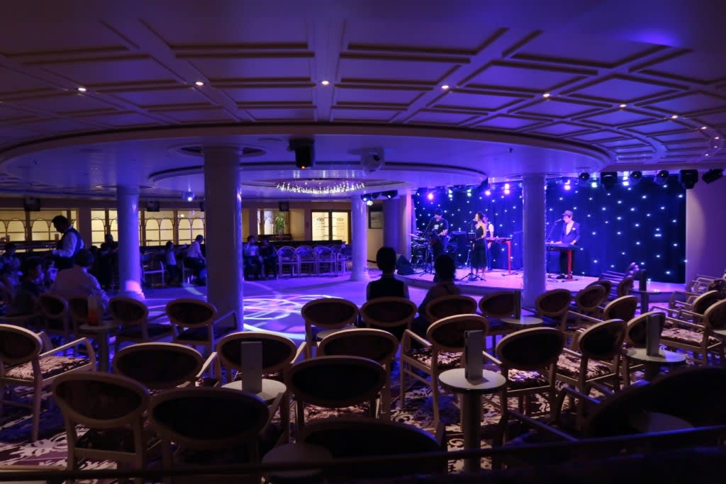 ステージとフロアをぐるりと取り囲むように座席がある『マスクラウンジ』。収容人数は390人。夜はムーディーな生バンド演奏がありました。日本の歌を中国語で歌っていたのはなんとも微妙な感じでした。夜遅くになると、コスタお得意のディスコが催されていた模様です。