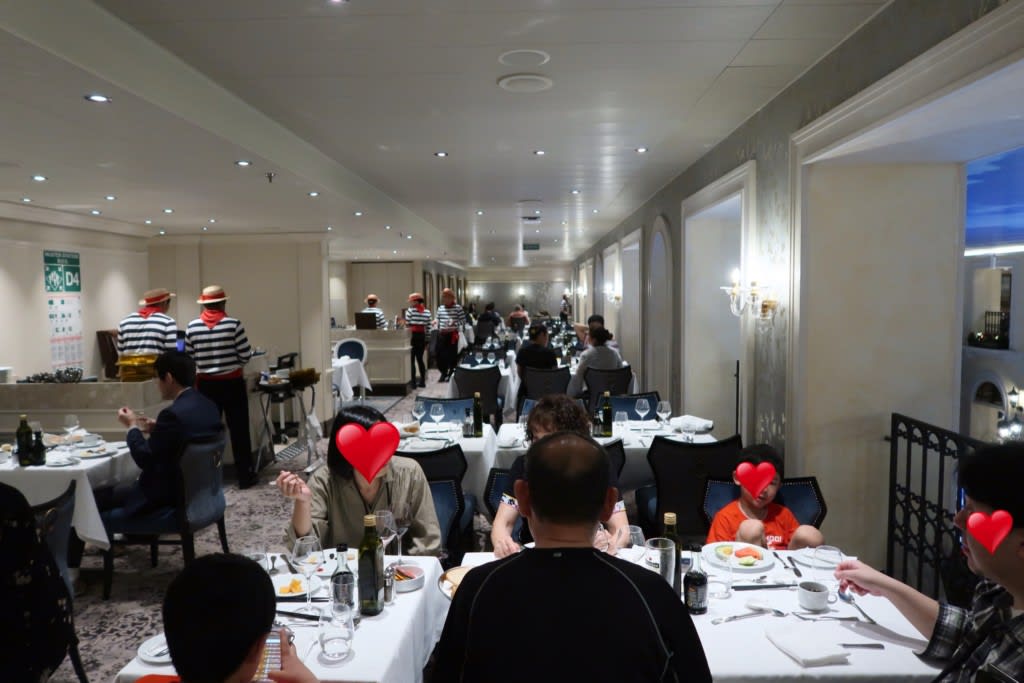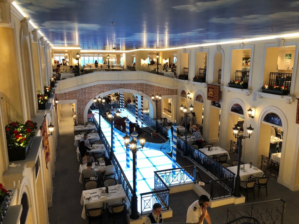 デッキ3と4の後方は吹き抜けになっているカナル・グランデレストラン。ゴンドラがある3デッキの上は…