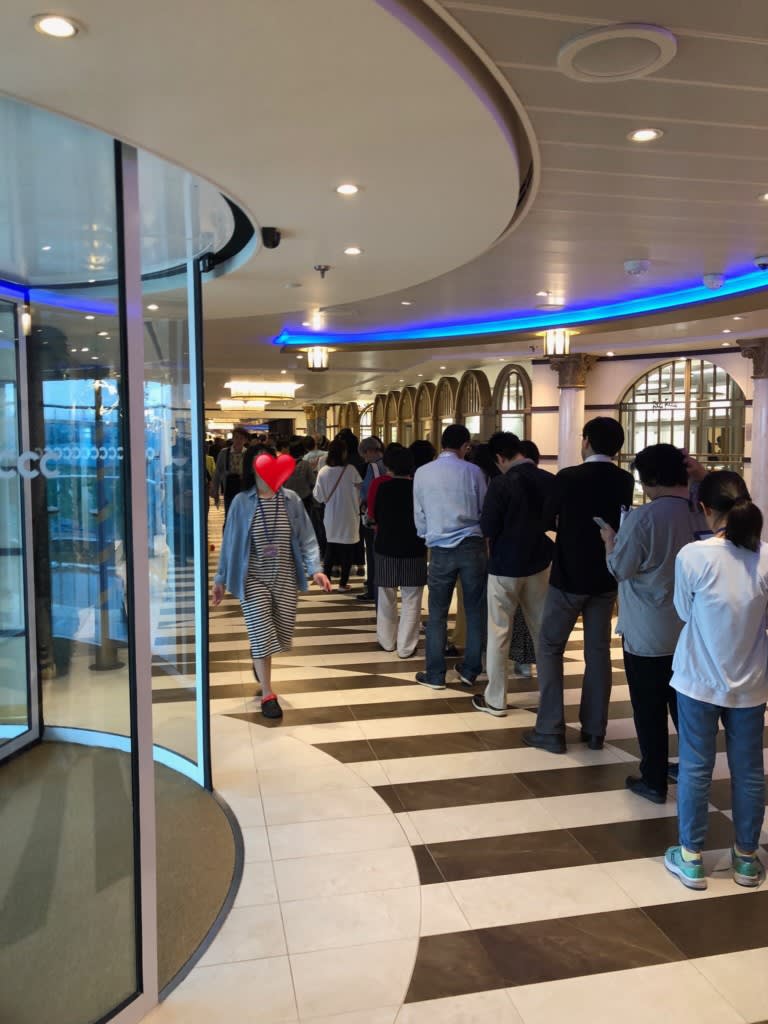 先頭が見えないくらい後方まで列ができていました。先頭の人は噂によると「朝6:30から並んでいたらしいよ。」とのこと…。下船するのに整理券もびっくりですが、そのために早めに並ぶということは…日本人ならあり得ますよね。完全に出遅れました!