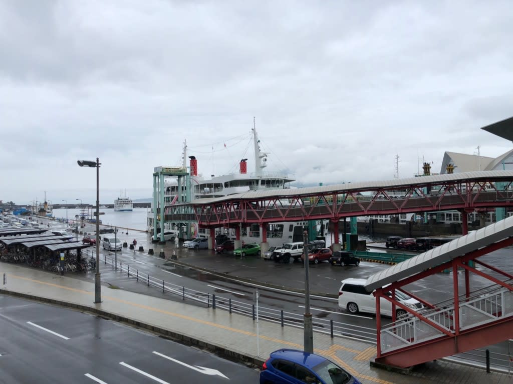 雨も本格的に降り、大通りのゆるい坂を歩いている時に歩きに慣れている私でもちょっと後悔…。脇田駅への徒歩移動はマリンポートから35分ということを船に戻ってから知りました。ここで体力は使わない方がいいかもしれません。