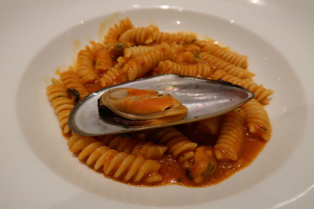 ムール貝、トマト、チリソースのパスタ。見た目通りトマトベースのパスタ。そして想像通りかなり味が薄かったです。