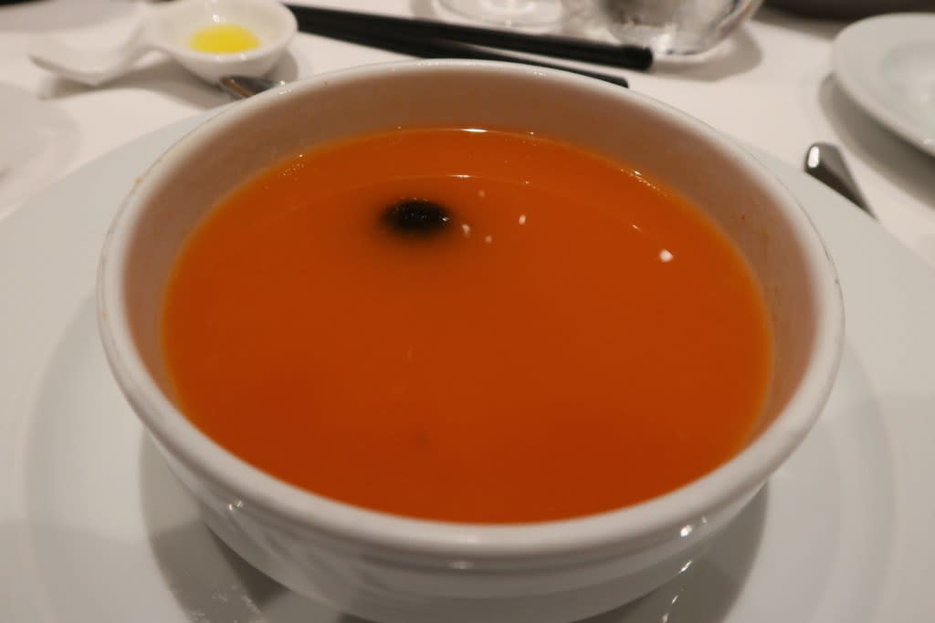 トマト、オリーブ、ヒラメのスープ。ほとんどトマト風味。浮いているのは黒オリーブです。