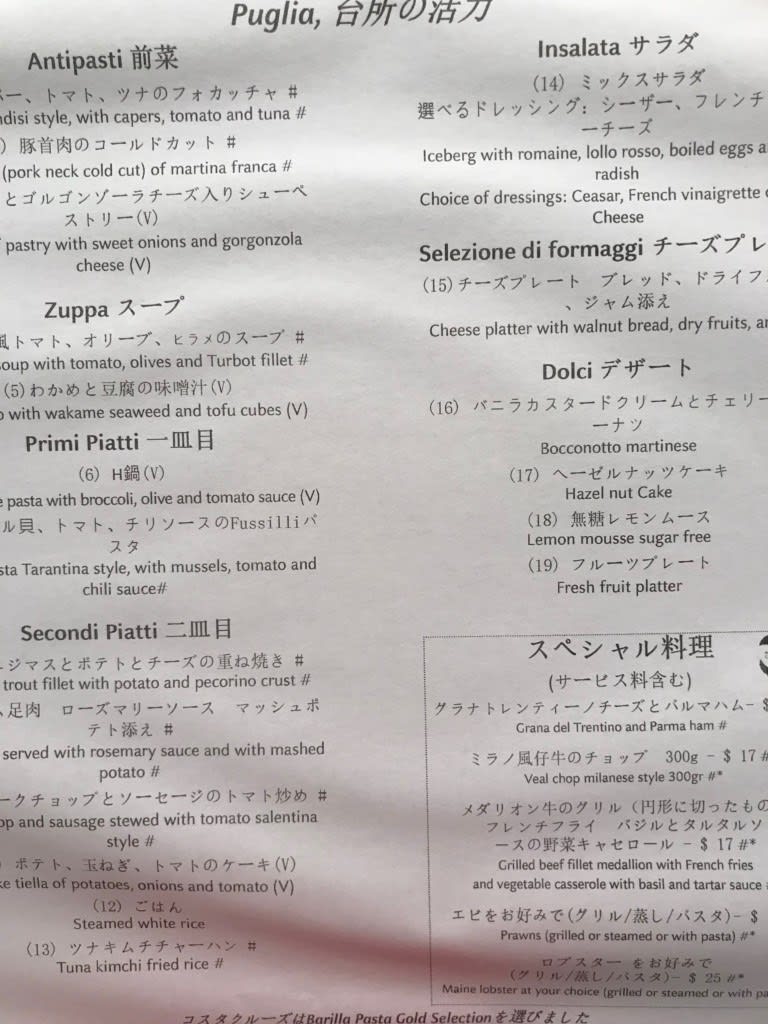メニューのサイズがA3位なので全部が写真に収まりません。そして、我がテーブルのお料理担当のクルーは優秀なので注文取りが早いのでメニューを渡されてから時間をかけずに選びます。