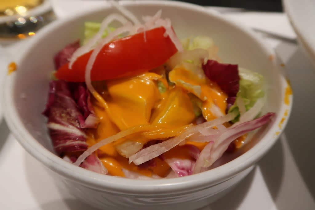デザートの直前にサラダ。この日はドレッシングが沈んでなかったので出来たてを持ってきてくれたようです。