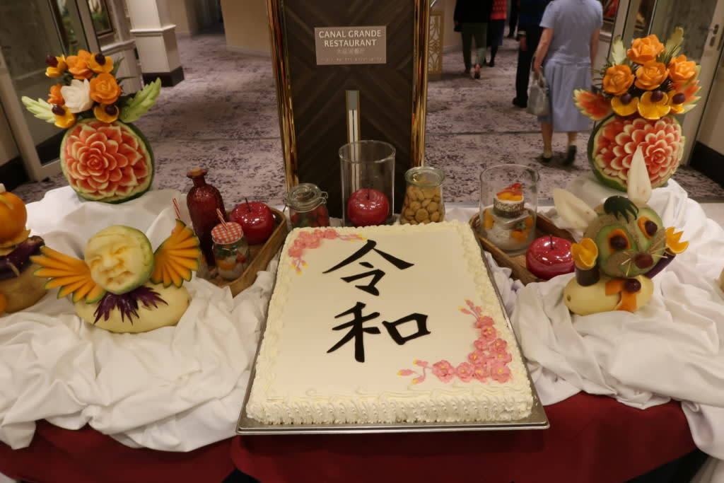 船内に戻ると、ブッフェレストラン には『令和』ケーキが。文字が踊ってますね。