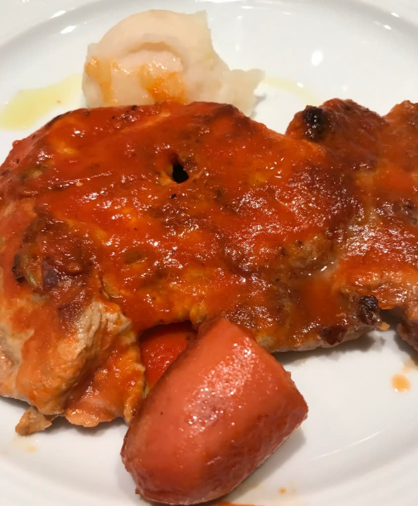 ポークチョップとソーセージのトマト炒め。豚肉柔らかい、ですが料理名と見た目に相違なく想像通りの味です。ちょっと甘めでした。