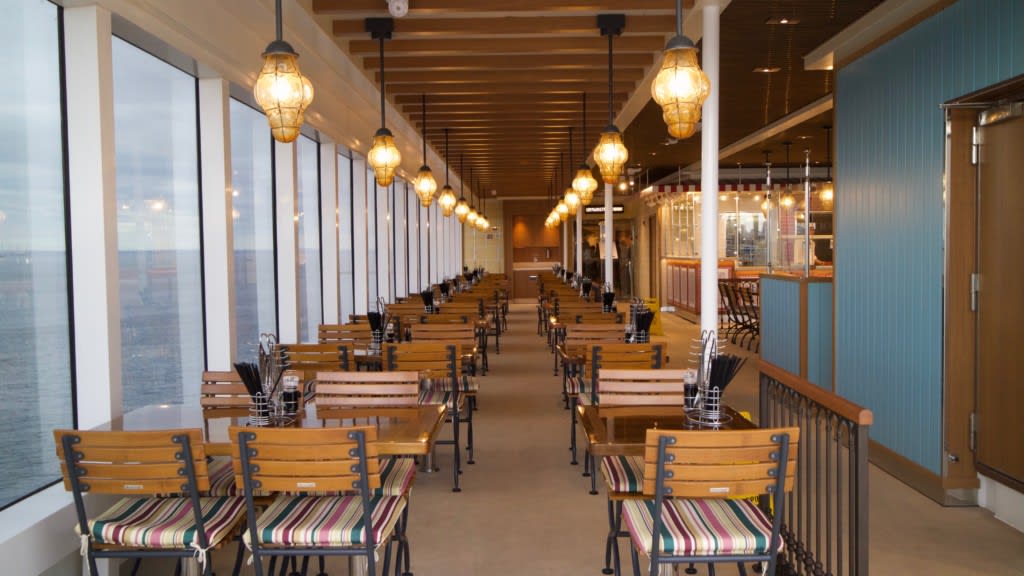 ナポリ・ピッツァはデッキ10の最後方にあるので、テーブルは半屋内になっています。お天気がいいときは満席ですが、雨風が強いと吹き込むのでガランとしています。ピザとビールが合いそうな空間でした。