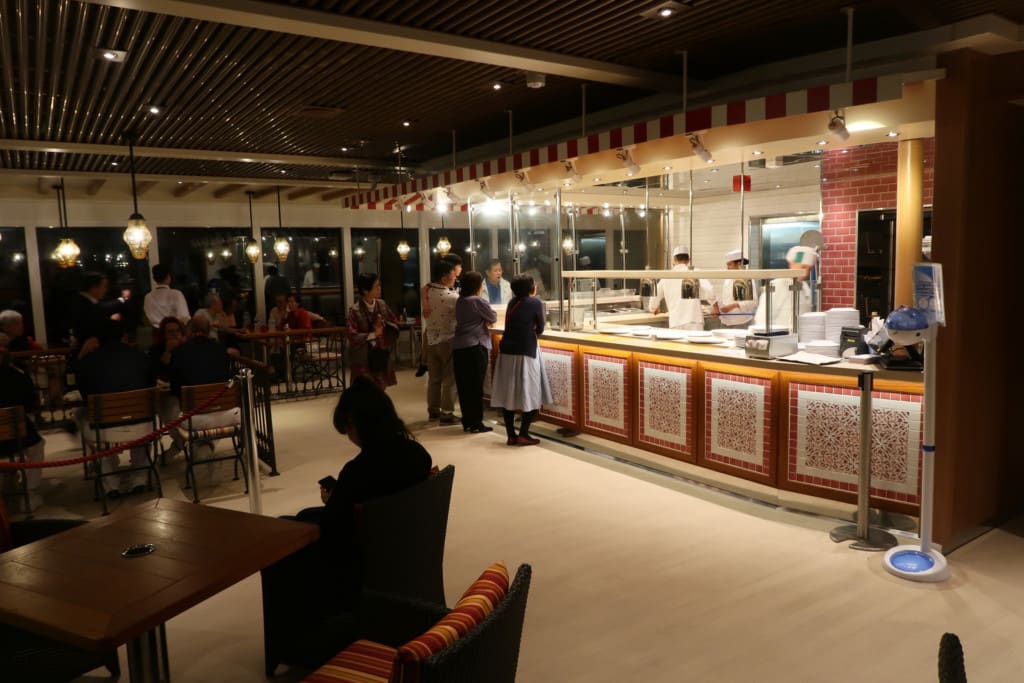 ランチのピッツァナポリで提供されるピザは無料です。ランチの営業(12:00〜14:00)は終日航海日のお昼のみ。それ以外はディナー営業(18:00〜25:00)のみでした。