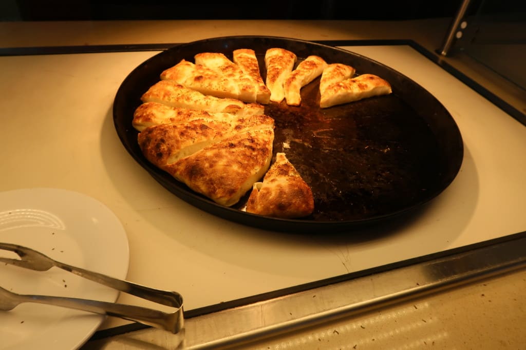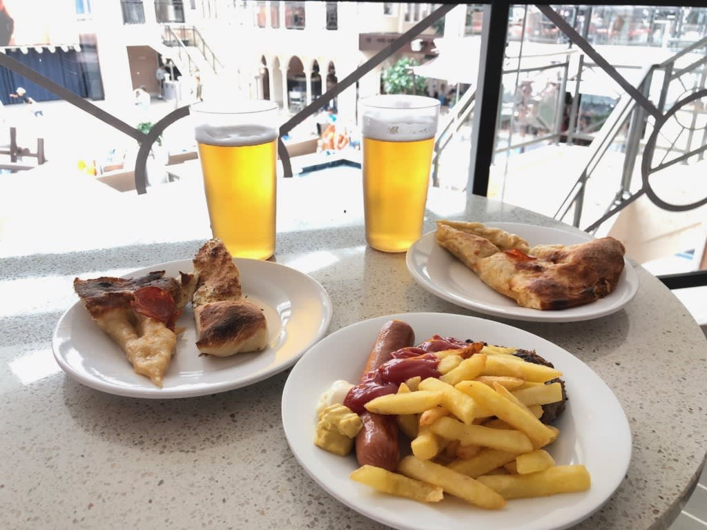 席がないので少し歩いてデッキ11のプールが見渡せるソラリウムのテーブルへ。ピザはご覧の通り厚い生地で「ピザ」というよりはこれはもう…「フォカッチャ」です。いいえ「パン」かな。