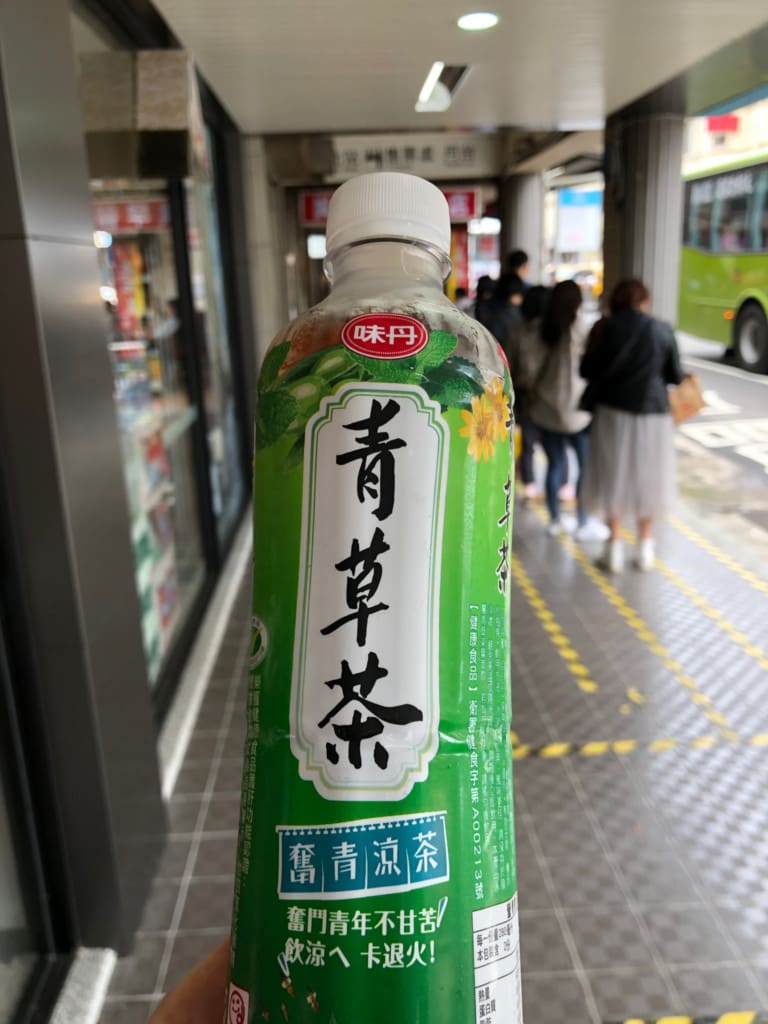 すったもんだの末にコンビニで購入した『青草茶』。台湾が初めての主人に飲ませたかった『台湾のペットボトルのお茶』。台湾のペットボトルのお茶は甘いんです。