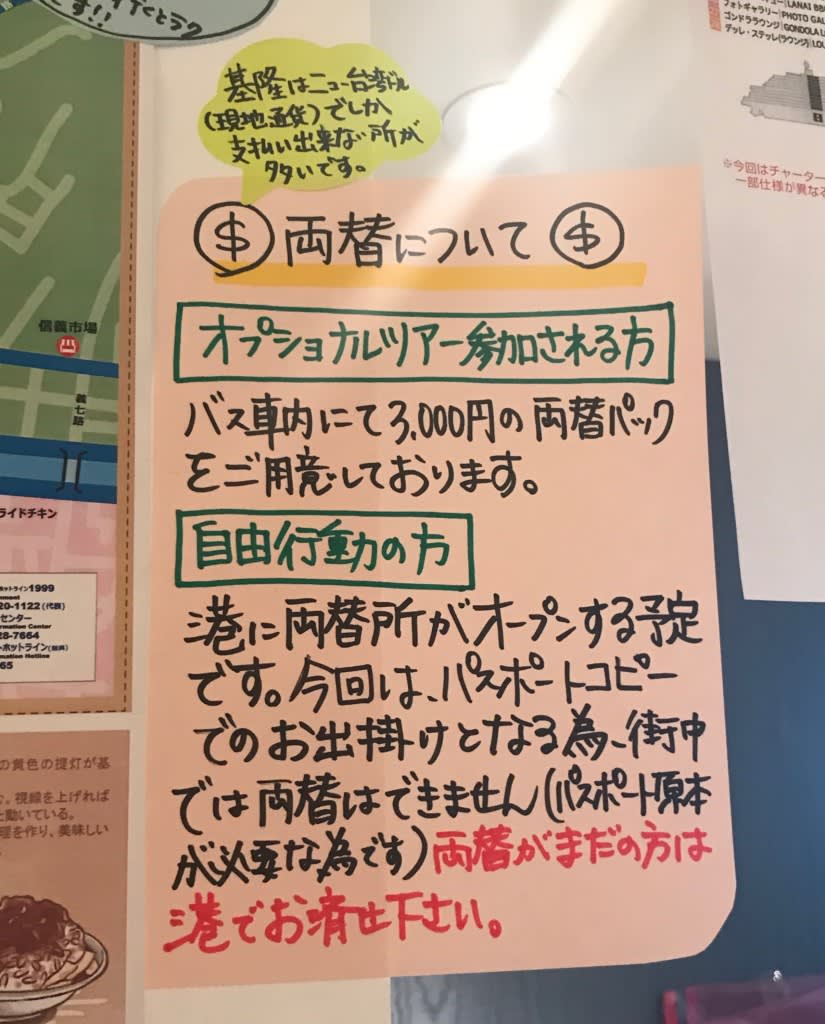 基隆の街中での両替はパスポート原本が必要だったみたいです。パスポート原本は乗船時コスタベネチアに回収されていますので、下船の際持ち歩いているのはコスタベネチアがくれたコピーのみでした。